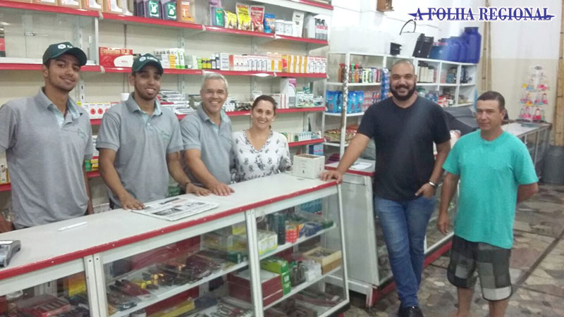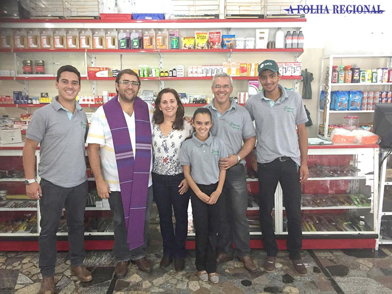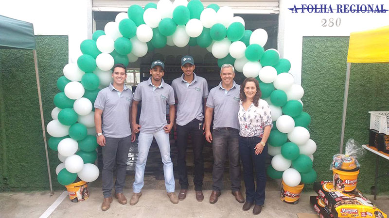 O casal de empresários JUAREZ E SIRLENE LEITE, os filhos Guilherme e Laís e colaboradores Luiz Eduardo e Giovani, receberam os cumprimentos de clientes, amigos e parceiros que prestigiaram a reinauguração. A benção da nova loja foi ministrada pelo Padre Henrique Neveston.