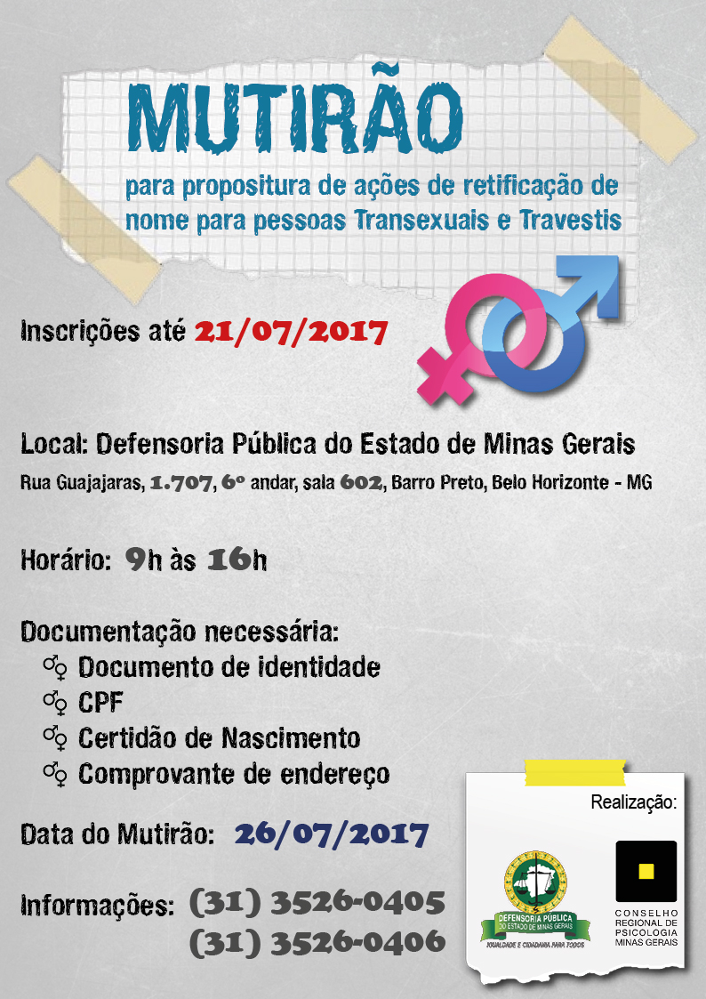 A Defensoria Pública de Minas Gerais (DPMG) realizará, no próximo dia 26 de julho, um mutirão para a retificação de nomes para pessoas transexuais e travestis. As inscrições devem ser feitas até esta sexta-feira (21/7). Veja mais informações no quadro abaixo.