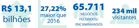 A Caixa Econômica Federal alcançou R$ 13,1 bilhões em negócios no Feirão CAIXA da Casa Própria de 2017. O evento, que terminou neste domingo (25), teve um resultado 27,22% maior que na edição de 2016 (R$ 10,3 bilhões). Foram fechados ou encaminhados mais de 65 mil contratos, representando um crescimento de 13,8% em relação à edição anterior (57 mil).