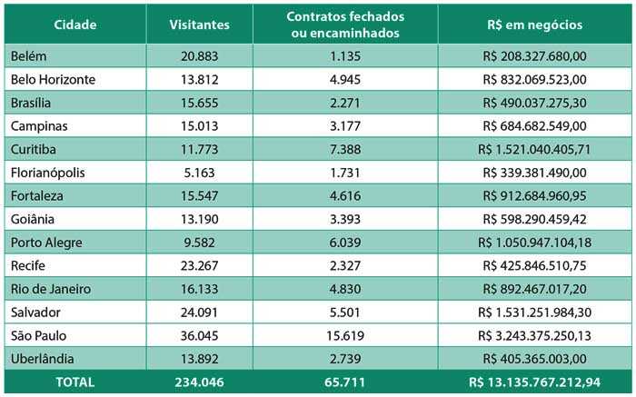 Neste final de semana, de 23 a 25 de junho, mais de 42 mil visitantes foram ao Feirão, que ocorreu nas cidades de Brasília (DF), Curitiba (PR) e Fortaleza (CE). Cerca de 14 mil contratos foram fechados ou encaminhados e o volume de negócios superou R$ 2,9 bilhões nas três cidades.