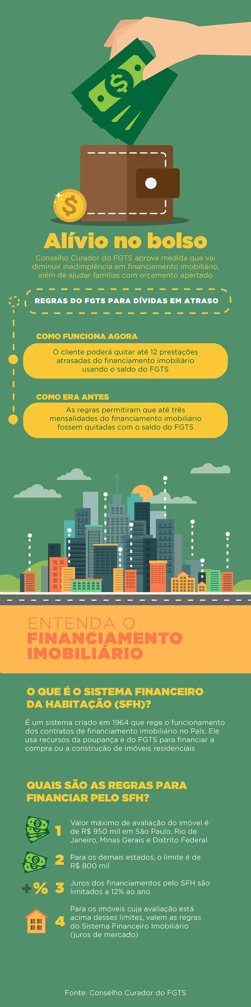 O Sistema Financeiro de Habitação é um mecanismo de incentivo à aquisição da casa própria que foi regulamentado em 1964 e orienta a maior parte dos financiamentos imobiliários no País. Os contratos de empréstimo são firmados com base nos recursos oriundos da poupança ou do FGTS.