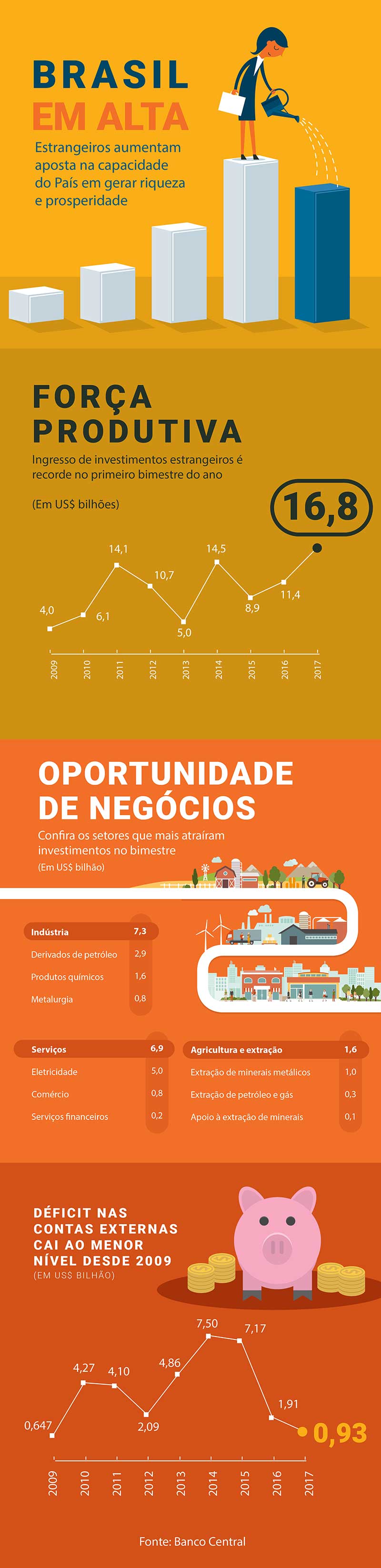 Diante das reformas econômicas implementadas pelo governo federal, o Brasil conseguiu reconquistar a confiança dos agentes econômicos e voltou a despertar o interesse dos investidores estrangeiros. Nos primeiros dois meses do ano, US$ 16,8 bilhões entraram no País, valor recorde para o primeiro bimestre do ano.