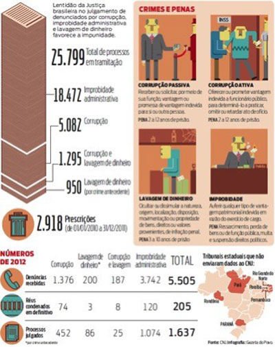 Mas a negligência ou conivência da Justiça (frente aos poderosos) é um fenômeno isolado ou bastante corriqueiro? É frequente e onde isso ocorre podemos afirmar que estamos diante de uma cleptocracia (que se caracteriza não apenas pela roubalheira geral do patrimônio público, senão também pela impunidade dessa ladroagem). Considerando-se os dados de 2012 temos o seguinte: a Justiça brasileira, nesse ano, condenou 205 pessoas por corrupção, lavagem e improbidade. Pesquisa do Conselho Nacional de Justiça mostrou ainda que, entre janeiro de 2010 e dezembro de 2011, quase 3 mil processos por esses tipos de crime foram extintos por prescrição. Infográfico feito pelo jornal Gazeta do Povo mostra o seguinte (vide quadro)