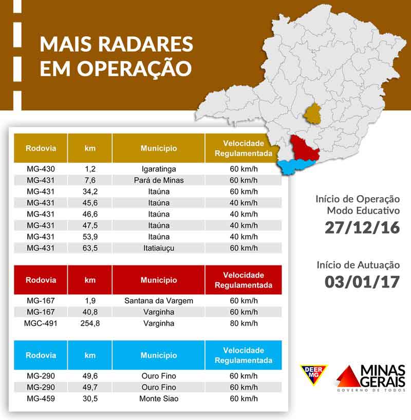 Mais quatorze novos radares entraram em funcionamento em modo educativo, a partir da terça-feira (27/12), nas rodovias sob responsabilidade do Departamento de Edificações e Estradas de Rodagem de Minas Gerais (DEER/MG). Eles estão instalados nos seguintes municípios: Igaratinga (MG-430, quilômetro 1,2); Pará de Minas (MG-431, quilômetro 7,6); Itaúna (MG431, quilômetros 34,2, 45,6, 46,6, 47,5 e 53,9); Itatiaiuçu (MG-431, quilômetro 63,5); Santana da Vargem (MG-167, quilômetro 1,9); Varginha (MG-167, quilômetro 40,8 e MGC-491, quilômetro 254,8); Ouro Fino (MG-290, quilômetros 49,6 e 49,7) e Monte Sião (MG-459, quilômetro 30,5).