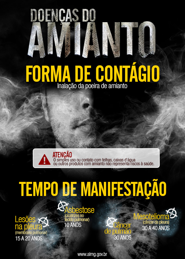 Proibição total - De acordo com a Secretaria de Estado de Saúde, entre 2007 e 2014 Minas Gerais registrou quatro casos de trabalhadores expostos ao amianto e que apresentaram câncer e 22 casos de pneumoconioses (doenças pulmonares causadas pela inalação de poeira) que têm como causa o contato com o mineral. Os dados são do Sistema de Informação de Agravos de Notificação (Sinan), ligado ao Ministério da Saúde.