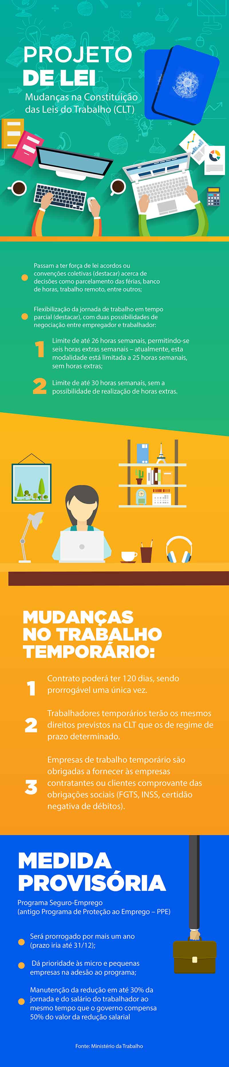 Também serão fixadas novas regras sobre os contratos de trabalho temporários. A contratação de trabalhadores para essa modalidade será ampliada de 90 para 120 dias, podendo ser prorrogado uma única vez pelo mesmo prazo.