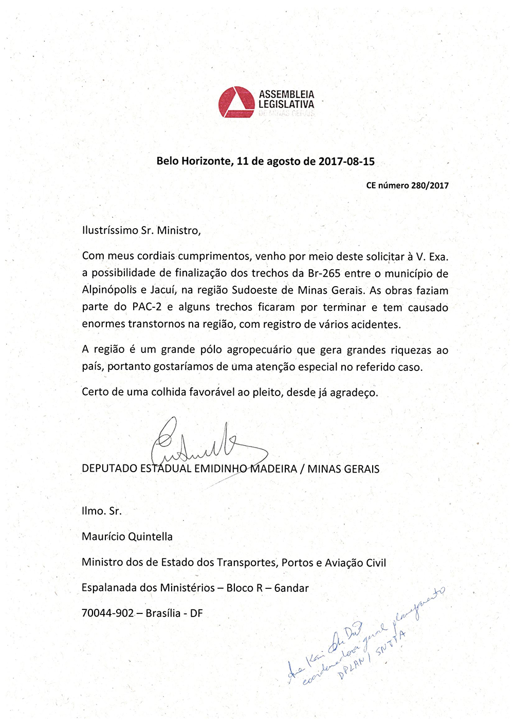 O deputado Emidinho Madeira, que tem feito uma mobilização intensa tanto em Minas como em Brasília em favor das estradas de toda a região, se mostrou otimista com as informações do DNIT. “Temos que juntar todas as forças políticas da nossa região, prefeitos, deputados estaduais e federais para buscarmos uma ação mais rápida para a BR-265. Transito constantemente por Alpinópolis, Bom Jesus da Penha, Jacuí e sei muito bem como é o sofrimento dos usuários da estrada. Em época de seca é muita poeira, principalmente na subida da serra de Alpinópolis. Em período de chuva vários trechos ficam intransitáveis. A maior parte da estrada já foi feita, mas é preciso que se tenha mais urgência para concluir uma via tão importante para o desenvolvimento de uma região de grande importância para a economia não só de Minas, mas também para o Brasil como um todo”, disse o deputado.