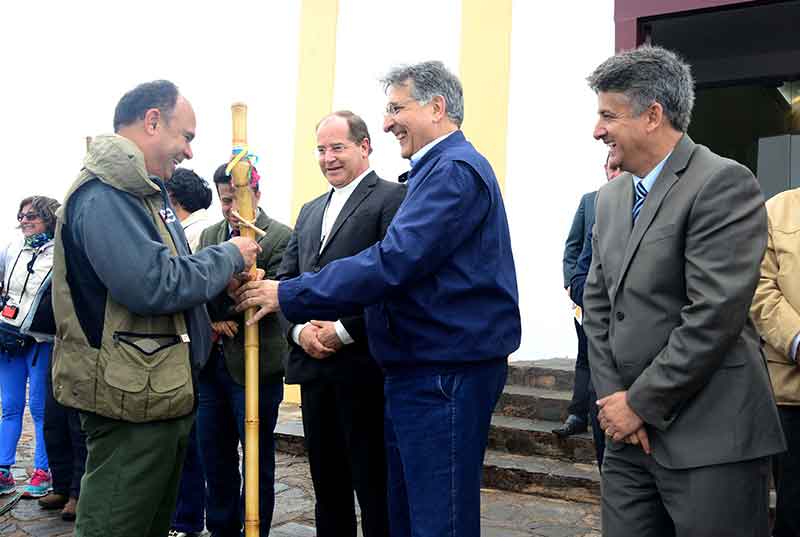 Durante o evento o governador Fernando Pimentel, juntamente com arcebispo de Belo Horizonte, Dom Walmor Oliveira de Azevedo, secretário de Estado de Turismo, Ricardo Faria, do deputado estadual Durval Ângelo, e o prefeito de Caeté, Lucas Coelho, entregaram cajados feitos pelo mestre bambuseiro Lúcio Ventania a quatro representes dos peregrinos. A caminhada, que se iniciou neste domingo, tem o nome de Rota 550, durará 37 dias e passará por 32 municípios mineiros e seis cidades paulistas.
