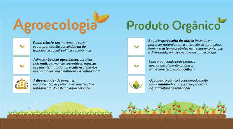As semelhanças entre o produto agroecológico e o orgânico são muitas, principalmente no que se refere ao modo de produção sem o uso de agrotóxicos. A legislação do orgânico é utilizada para nortear a produção do alimento agroecológico, que tem um viés mais social, buscando a harmonia constante com o produtor e o resgate da sua história e das suas práticas, enquanto o orgânico, muitas vezes, ganha um apelo mais comercial.