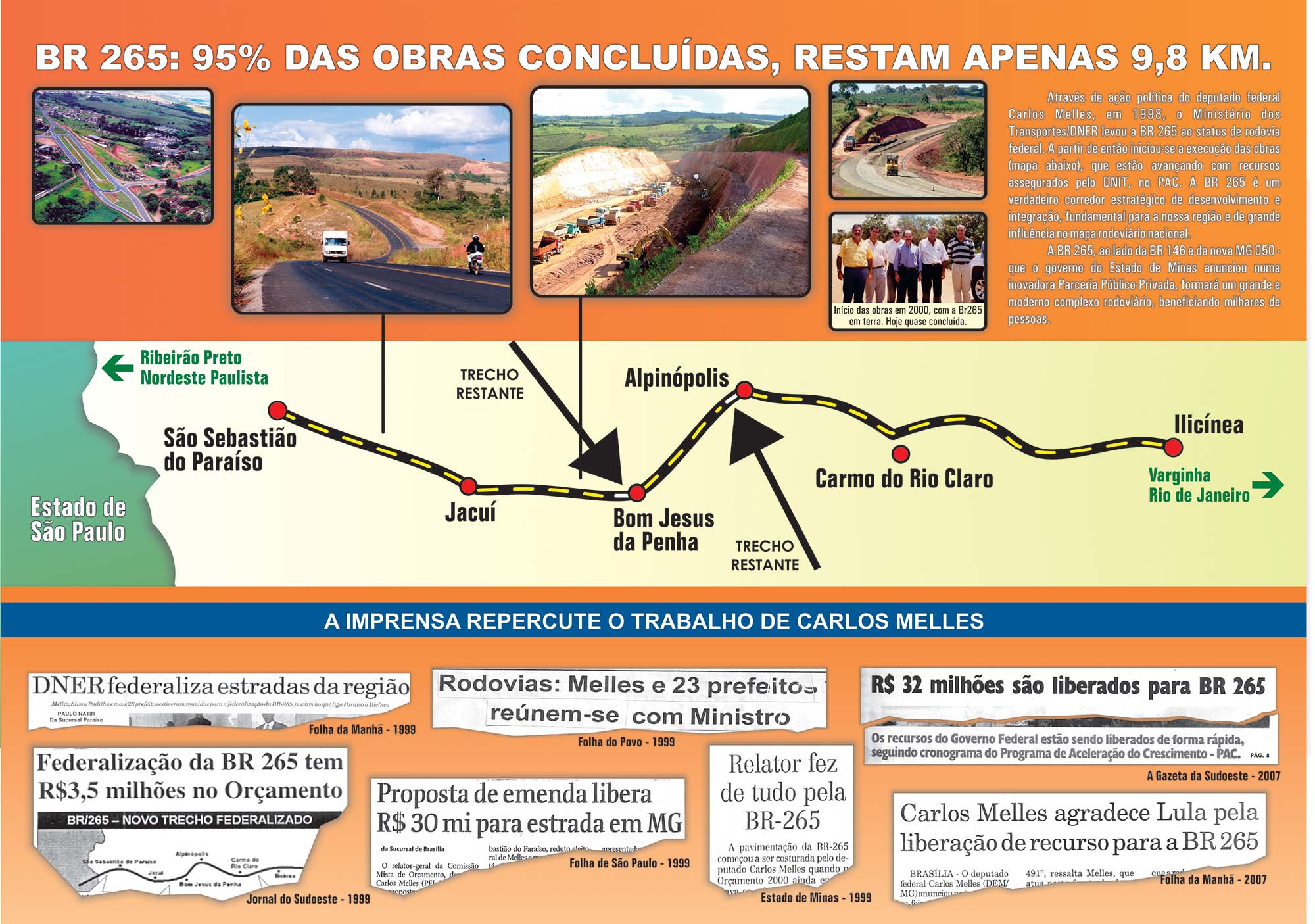 Carlos Melles apresentou uma farta documentação com o histórico da 146 e 265, constando que nos últimos anos ele próprio coordenou a colocação de emendas ao Orçamento, em parceria com vários parlamentares. As obras realizadas foram entre São Sebastião do Paraíso a Ilicínea, passando por Jacuí, Bom Jesus da Penha, Alpinópolis, Carmo do Rio Claro e Ilicínea. Depois de coordenar recursos para a pavimentação dos 135 quilômetros, Melles atua para finalizar os 9 quilômetros, como também conseguir obras de acesso a Alpinópolis - viabilizado num trabalho junto ao DNIT e criado pela portaria 1056 de 28 de junho de 2007; como também viabilizar o contorno de Ilinínea. Estas são as prioridades nesta etapa final de conclusão da 265.