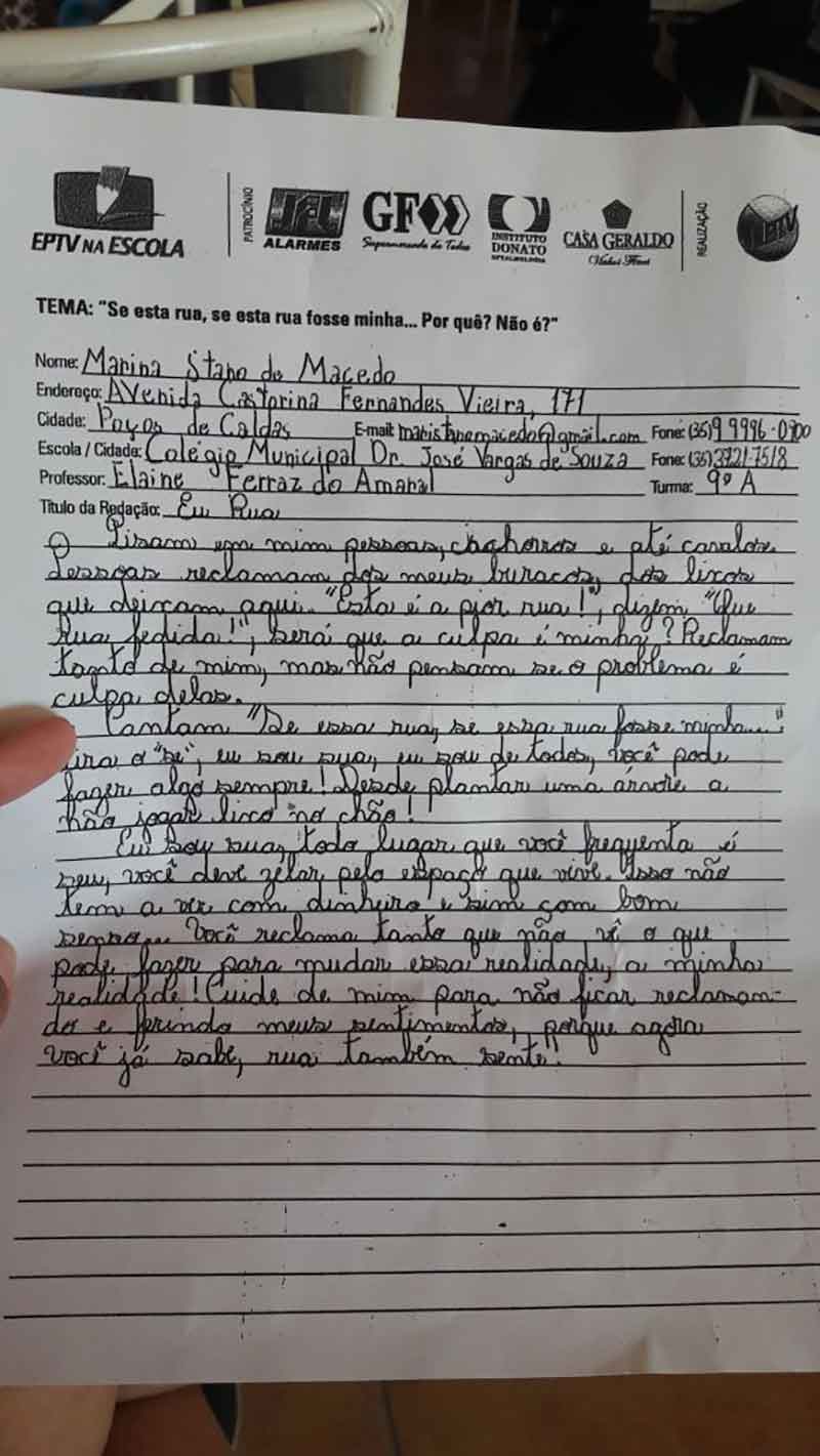 Este ano, as redações tiveram como tema para reflexão a seguinte frase: “Se esta rua, se esta rua fosse minha…” Por Quê? Não é? A proposta foi para fazer com que os alunos se expressassem sobre a importância de conservação da rua de casa e o espaço em torno da escola. Participaram do concurso 132 municípios, num total de 21.827 redações. Marina Stano, de Poços, ganhou com o tema “Eu rua.”