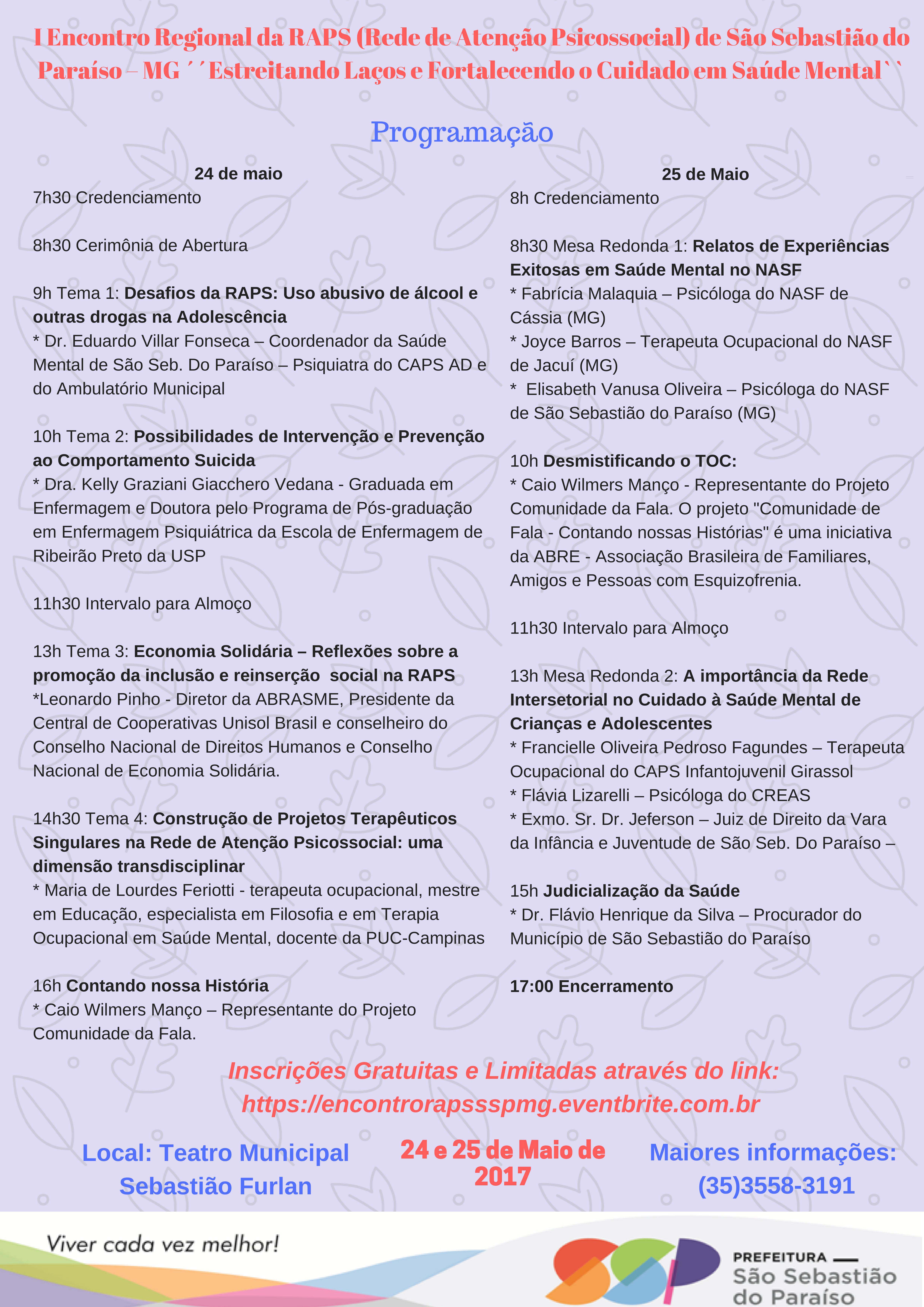 https://encontrorapssspmg.eventbrite.com.br. Mais informações pelo